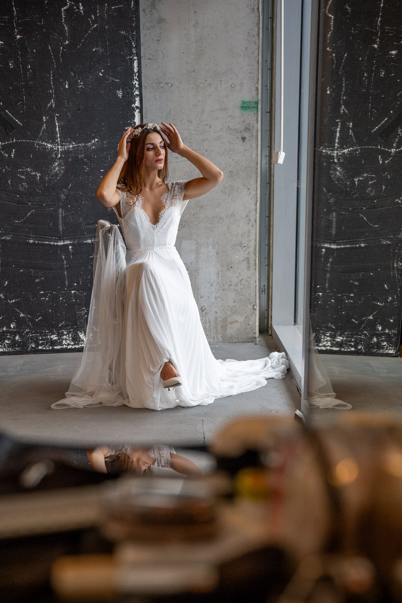 A woman dressed in a wedding veil and white dress, with dark hair, appears to be holding a small item near her lips in an indoor setting. View fullsize
