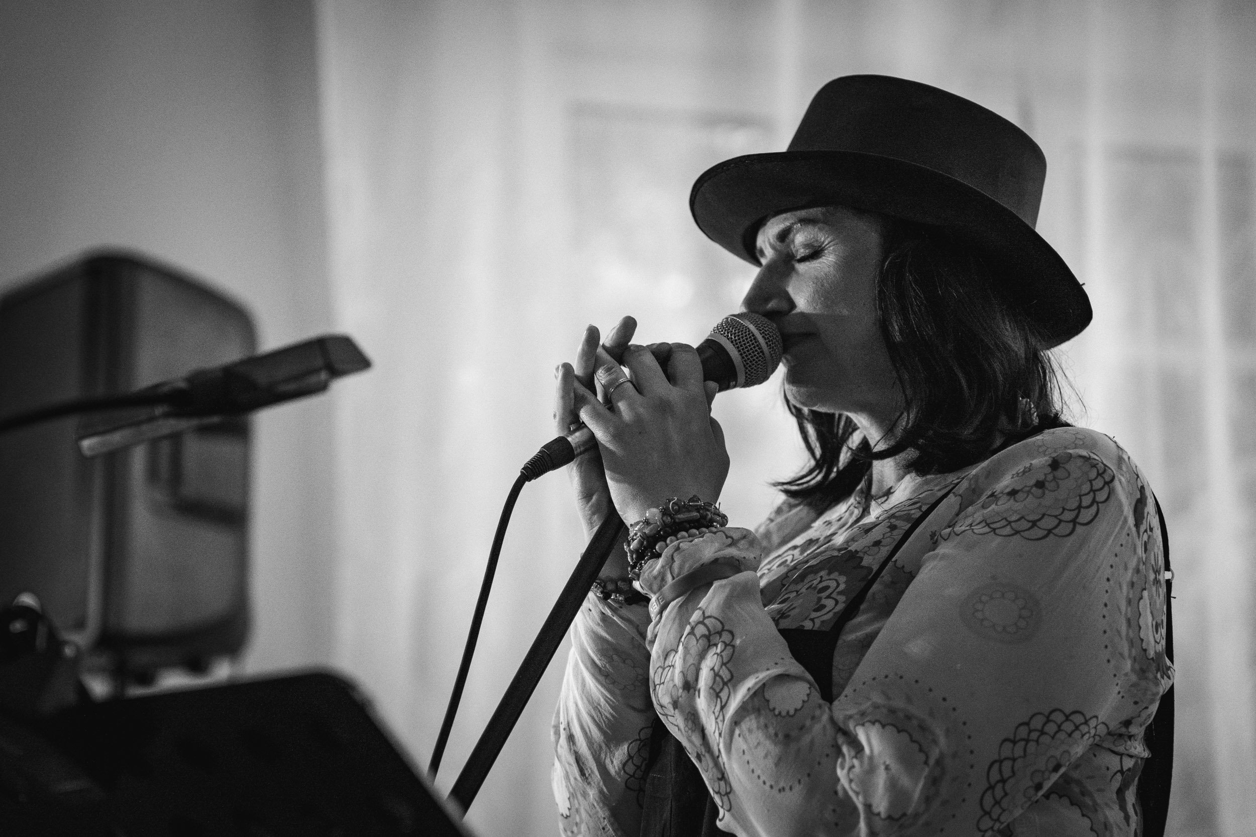 A woman singing passionately into a microphone, eyes closed, with a wide open mouth, wearing earrings and a fringed headpiece, in a black and white photograph. View fullsize
